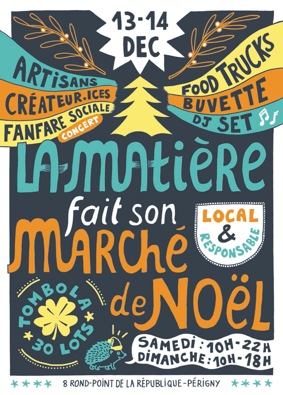 Comme l’année dernière, ce sera encore un week-end extra sur Périgny pour trouver vos cadeaux et vous faire plaisir, avec 3 marchés de créateurs locaux et responsables ! LA MATIÈRE s’associe donc à la Maison Mü et l’atelier Lieu Commun pour créer un véritable Parcours Créatif, où vous repartirez avec un petit cadeau si vous visitez ces 3 marchés…